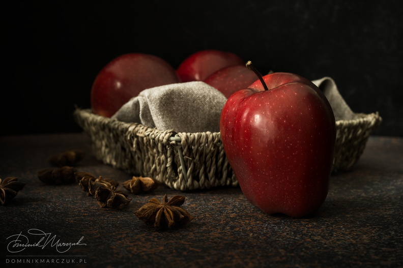 The subject was just a few apples. I placed some in a basket lined with a decorative tablecloth. I also strategically placed some star anise in the shot. I wanted cinnamon sticks but found none in the kitchen.