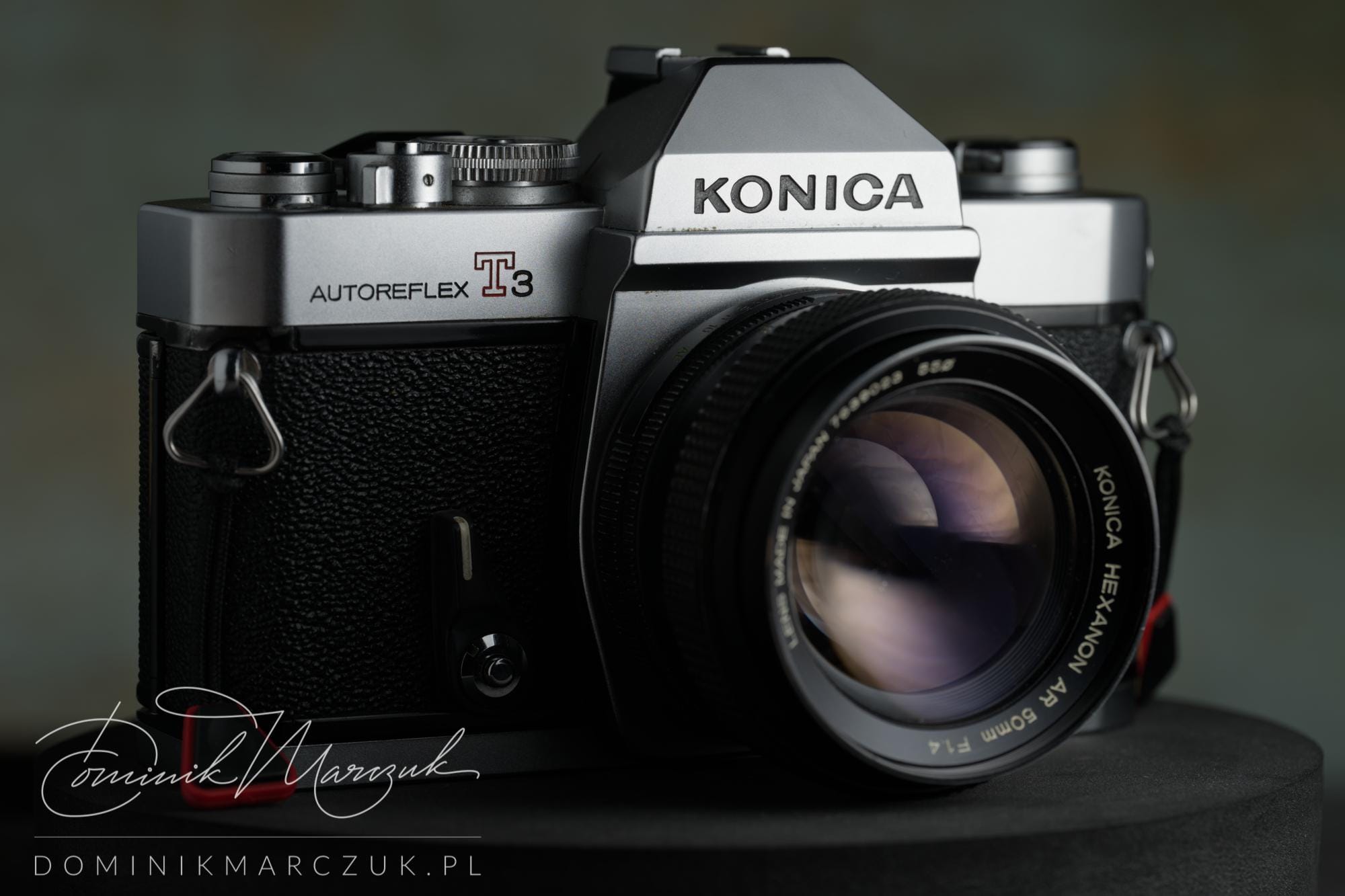 It would also be useful to have a depth-of-field preview button and an eyepiece curtain. An ersatz curtain, a plastic cover attached to the camera strap, is available, provided the camera is sold with the original Konica strap. It's a gimmicky tool that can be split into two parts to fit over the sides of the viewfinder eyepiece. It relies on the strap itself to act as the cover. I have one, but it's short, narrow, and impractical, so I prefer to use my own strap. The eyepiece cover contraption won't fit on it though.